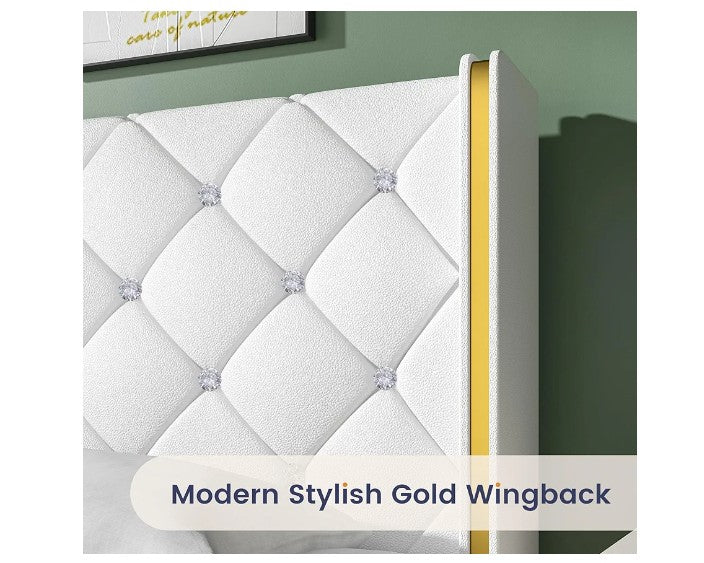 King Size Bed Frame and Headboard, Modern Upholstered Bed Frame with Diamond Tufted Headboard and Silver Wingback, Faux Leather, No Box Spring Needed, Easy Assembly,