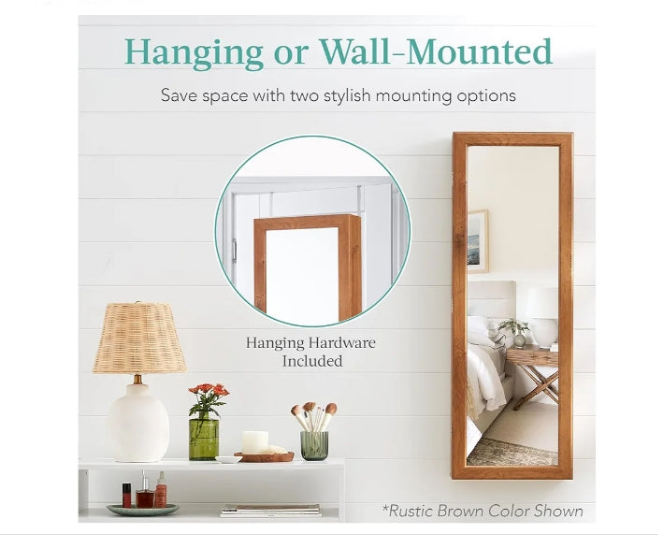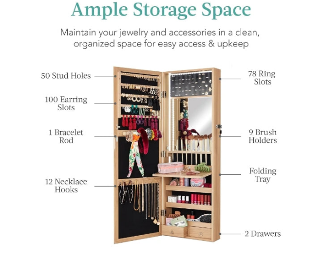 LED Mirror Jewelry Cabinet, Tall Lockable Wall or Door Mounted Jewelry Armoire Organizer with Mirror, 2 Drawers, Lock, Cosmetic Tray, Shelves -