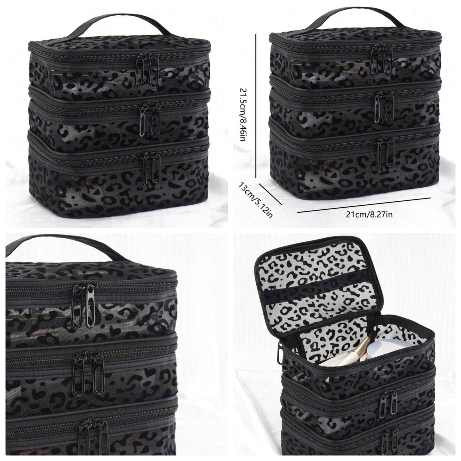 Leopard Print Fashionable 3 Layers Mesh Cosmetic Bag For Storage, Square-Shaped Makeup Bags, Holiday