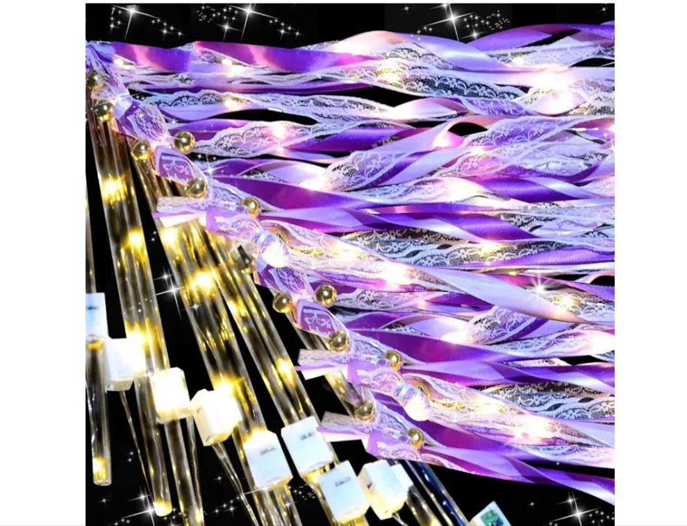 【Elegant Light Up Silk Fairy Wands 】Our sparklers wedding reception wands are knotted with 2pcs romantic wedding ribbons,1pc elegant lace streamers and warm white led lights.Gold bell on the top will make a charming sound,and these fantastic streamers are not tangle when wave it,these glow wedding send off wands are perfect props and will bring strong romantic atmosphere for wedding parties.