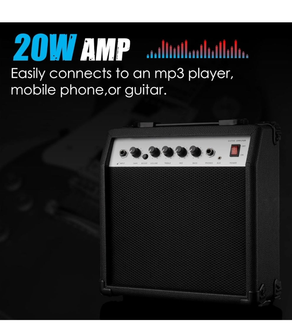 [20 WATT AMPLIFIER] This guitar pack Includes 20W Amp with Headphone Jack for practicing in silence, Input Jack and AUX Jack for Playing Along to Music on Phone or MP3 Player. Integrated Controls Include Grind, Gain, Bass, Mid, Treble & Volume functions.