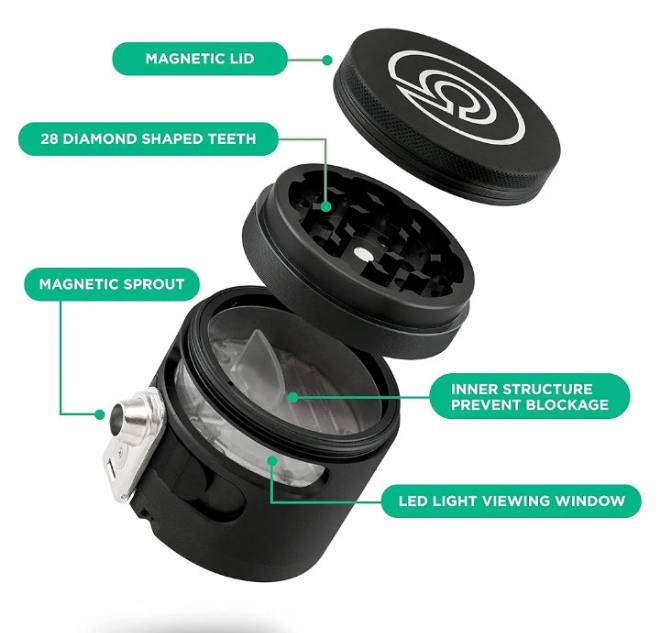 VIABLE & SECURE CONTAINER- Your items are securely stashed behind a slidable dispensing gate secured by powerful magnets. Even better, your item is stored in a compartment with a beautiful LED lighted viewing window so you can easily check items quantity. The large size means the grinder holds a good supply of items.