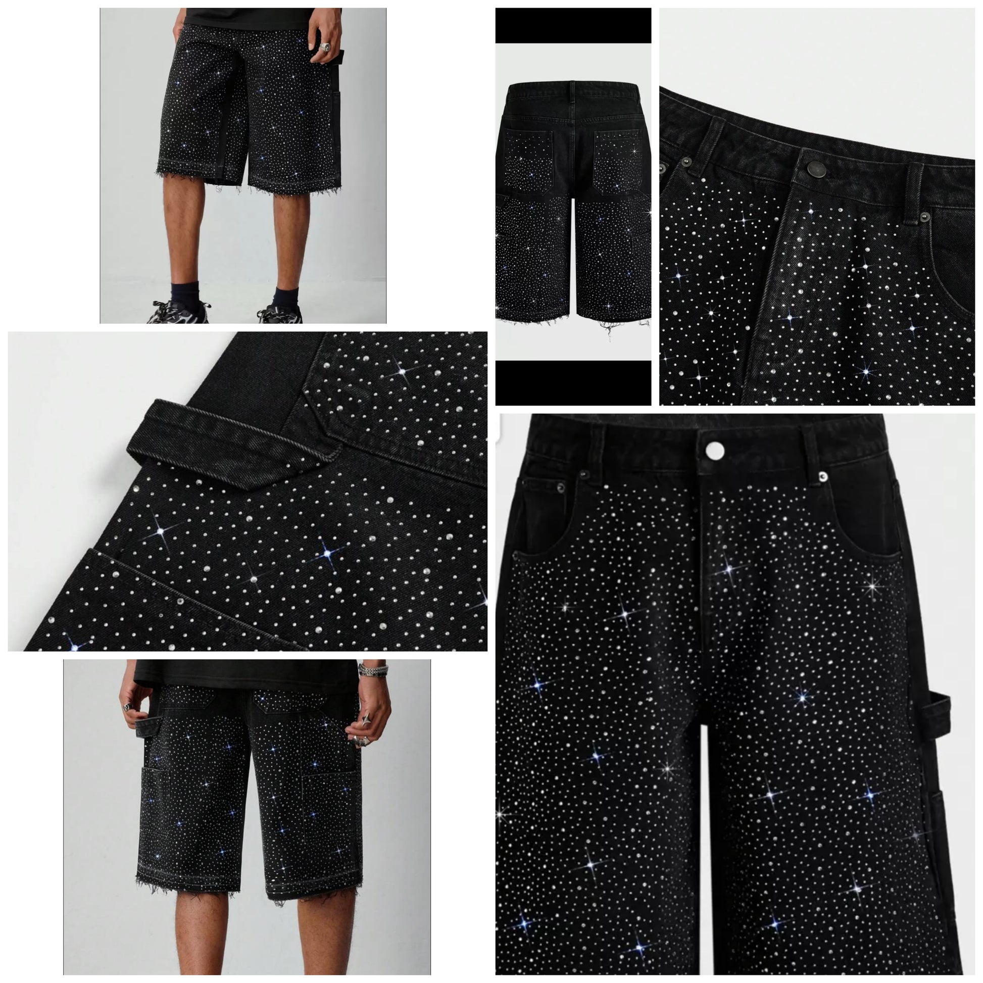 Men's Avant Sparkly Diamond Rhinestone Embellished Loose Denim Shorts COCOMONEY