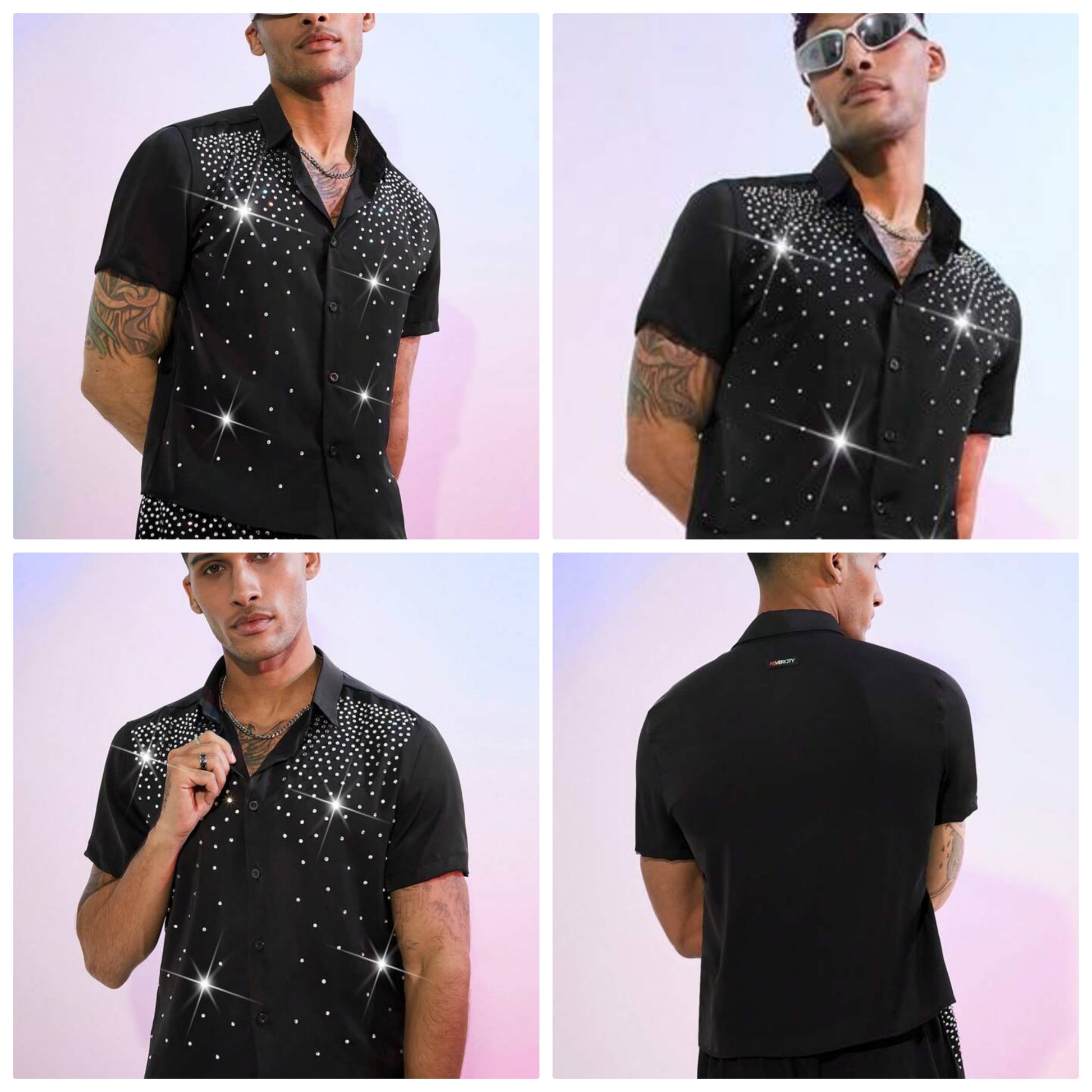 Men's Rhinestone Embellished Loose Fit Front Button Short Sleeve Casual Shirt COCOMONEY