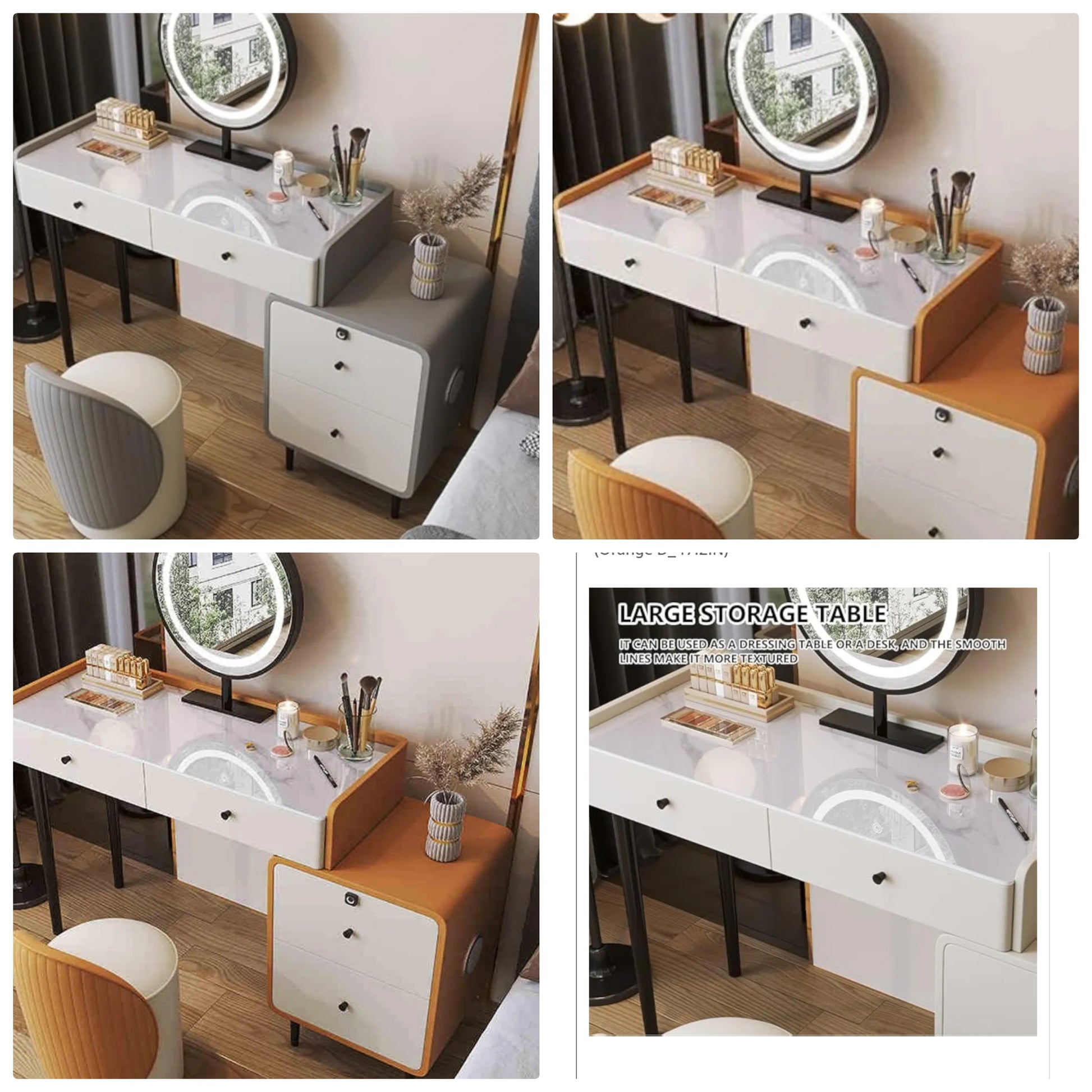 1. This versatile dressing table with mirror and lighting features a spacious surface that seamlessly converts into a dressing table and desk, perfectly matching any white, orange or grey bedroom decor. The dressing table is ideal for anyone looking for both style and functionality in a small or corner space.
