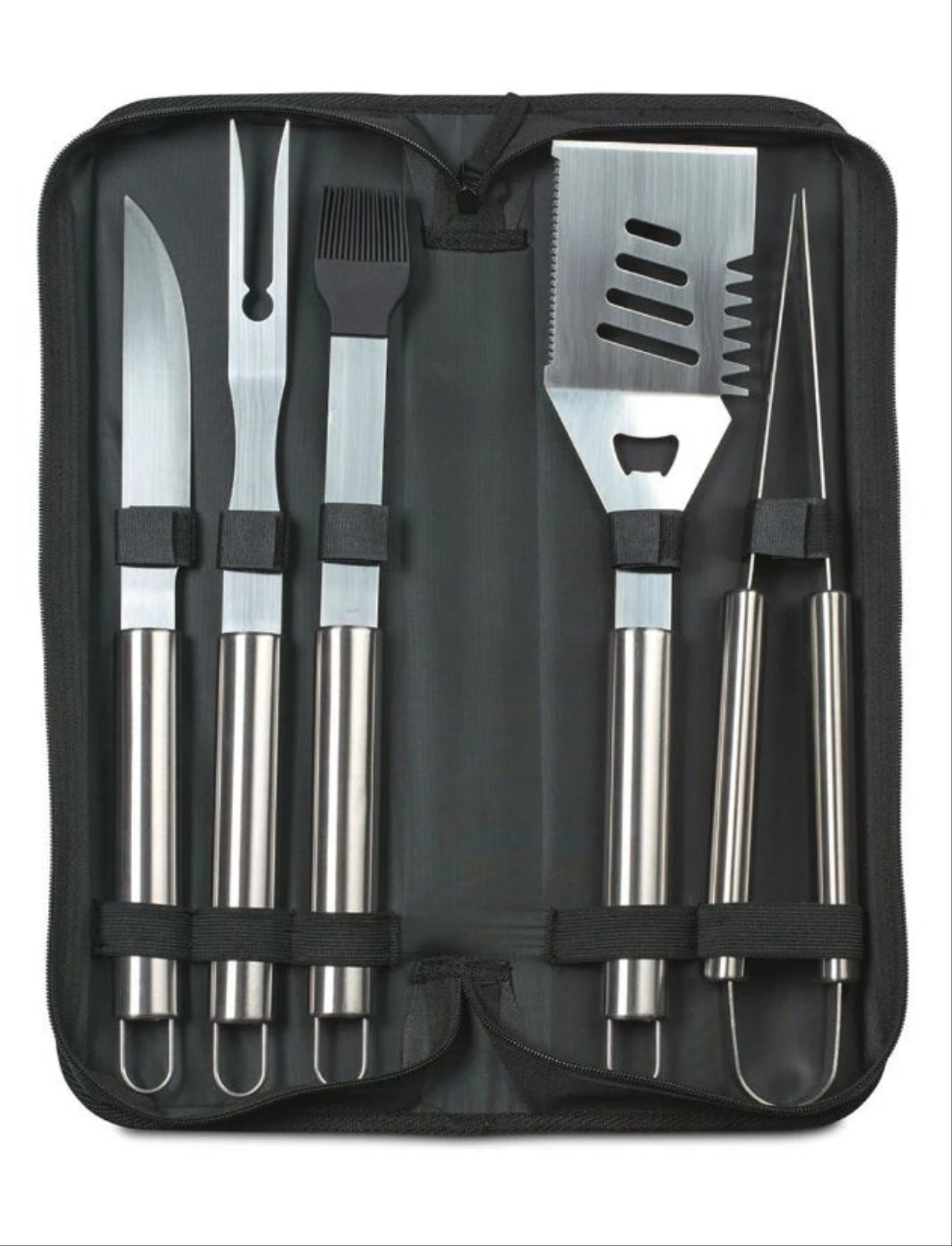 Tool set includes turner, fork, knife, silicone brush and tongs