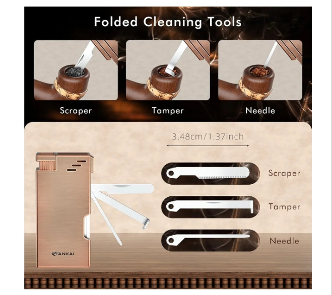 Pipe Lighter with 3 Cleaning Tools -- The scraper, tamper, and needle are folded inside the butane lighter; Everything you need is in this multitool pipe lighter for whenever or wherever you want to smoke a pipe
