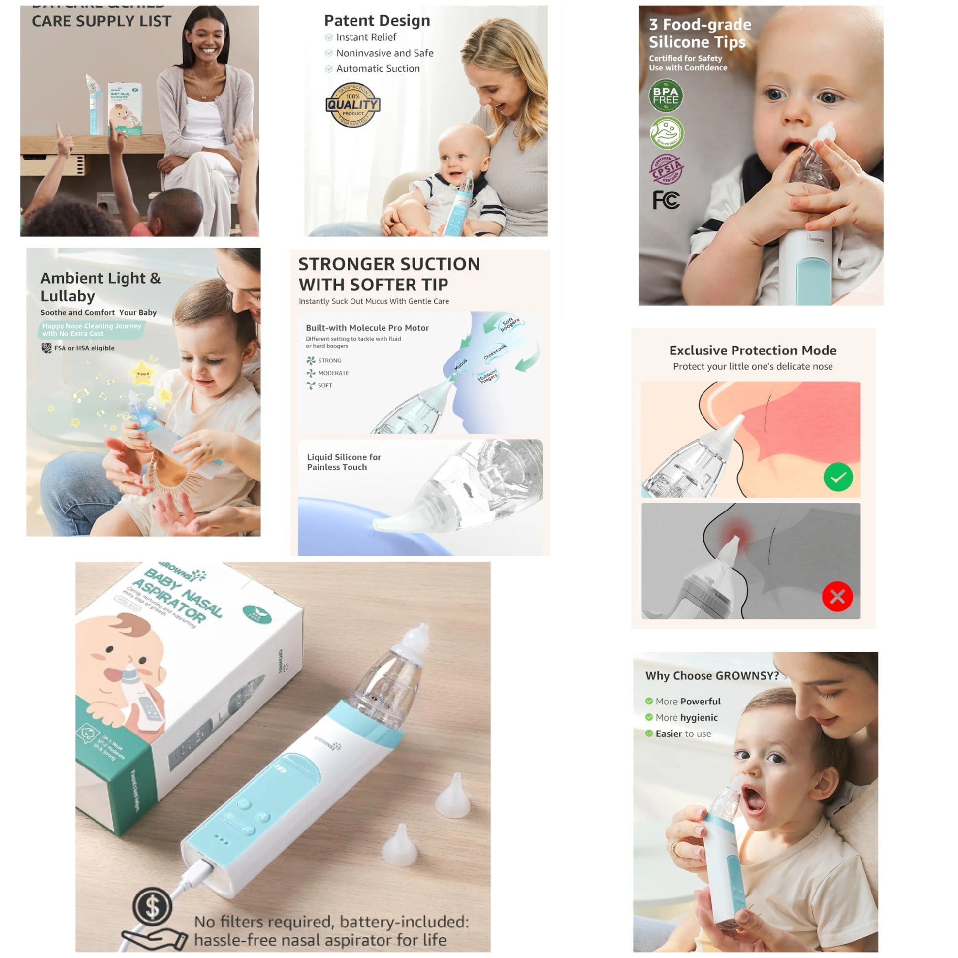 SAFE AND COMFORTABLE: Engineered by Pediatric ENTs, GROWNSY's patented baby nose sucker offers a unique anti-backflow technology. Experience the comfort of 3 food-grade silicone tips, designed to be ultra-gentle on your baby's delicate nasal passages. Prioritizing your child's safety and comfort, always. Newborn essentials must haves