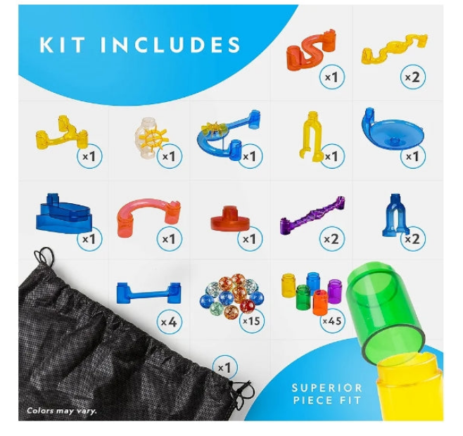 1 UV Light to Help your Marbles Glow BrighterSTURDY TIGHT-FIT PIECES – This construction kit is designed to fit together snuggly so your marble maze won’t fall apart while you play. With 5 sturdy bases, 15 exciting action pieces, and 45 clear smooth-run track pieces, our kit has countless imaginative configurations