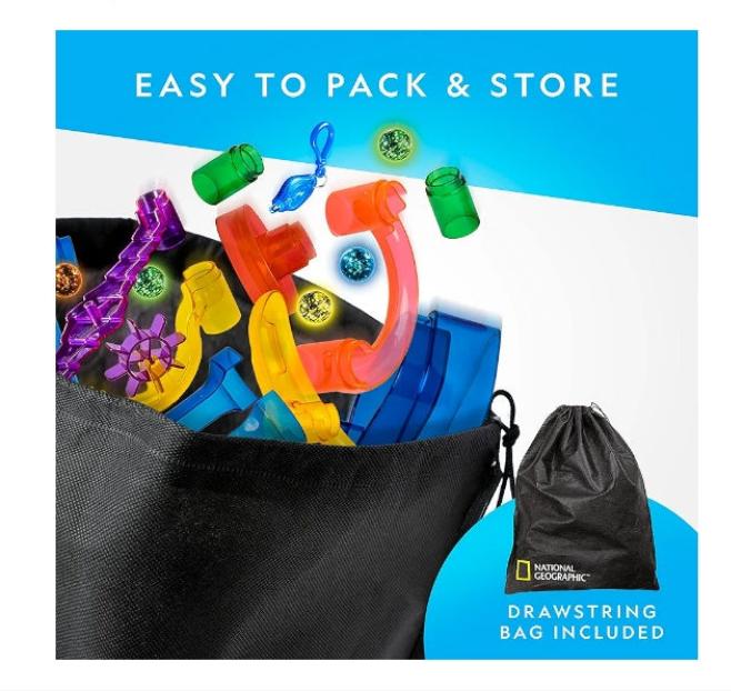 CONVENIENT STORAGE – A large storage bag makes it easy to store all your marble run construction pieces and glow-in-the-dark marbles in one place