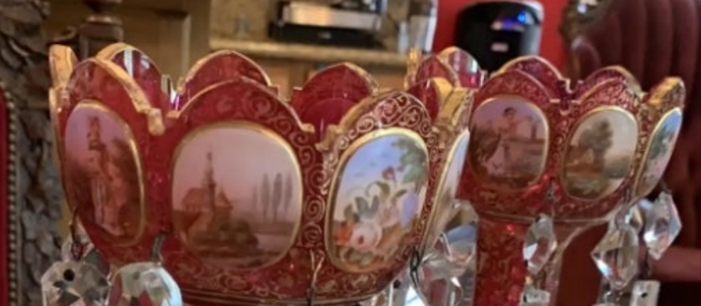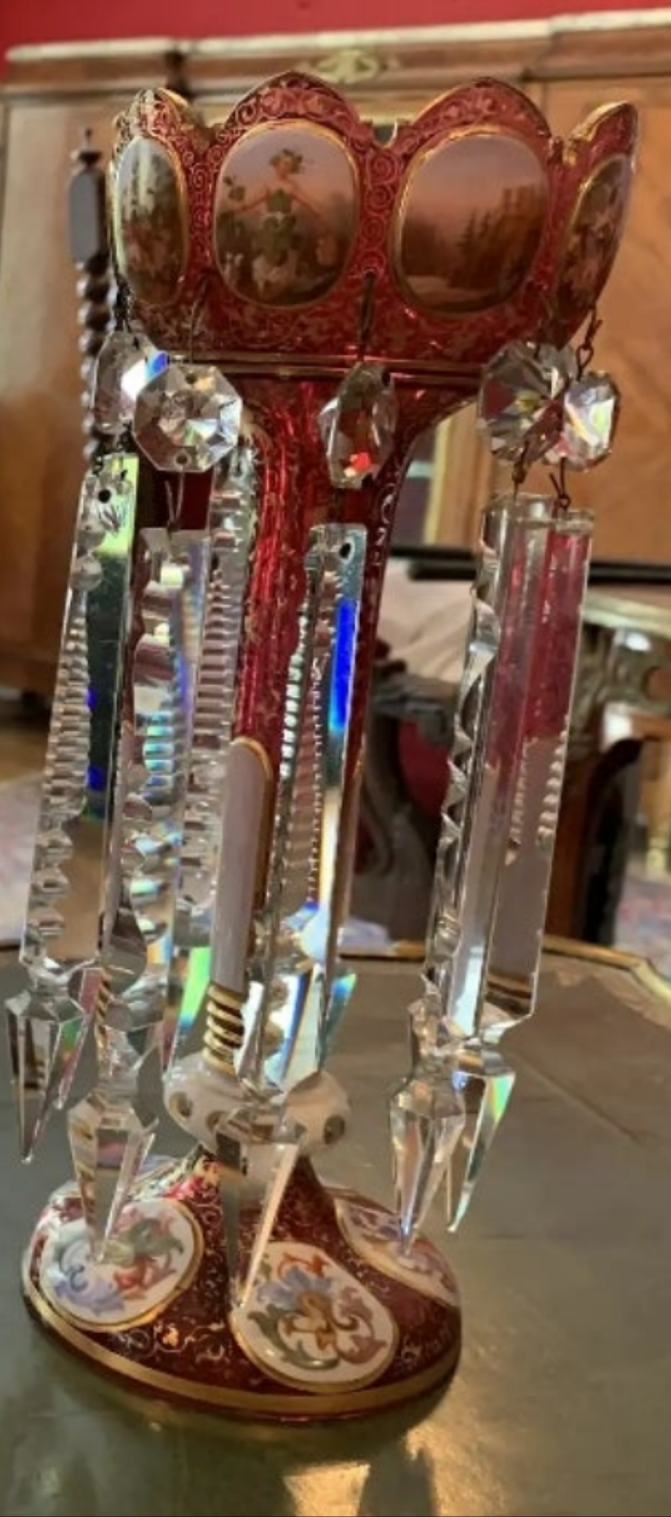 COCOMONEY.STORE,,,,AUTHENTIC VERIFIED INSPECED GUARANTEED,,,,we are pleased to introduce a very fine example of pair of Cranberry overlay Moser Bohemian hand painted lusters, circa 1900. This beautiful pair, in excellent condition, stands 12 inches tall. Decorated with gold, hand painted scenes, flowers and portraits. The prisms are cut with precision, spectacular design. The cranberry color is the most desirable color for the lusters of this kind.