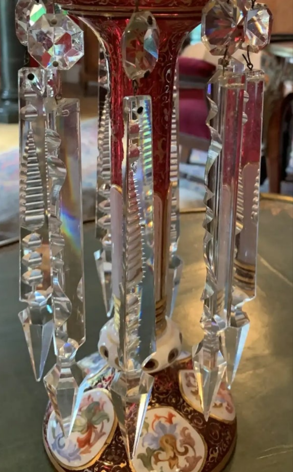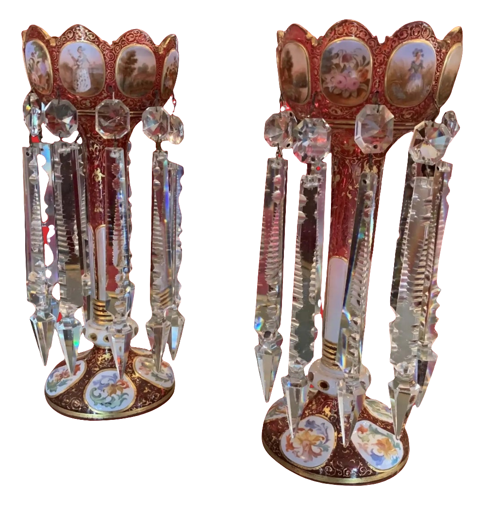 Pair of antique Moser Bohemian cranberry overlay hand painted lusters, circa 1900s cranberry glass