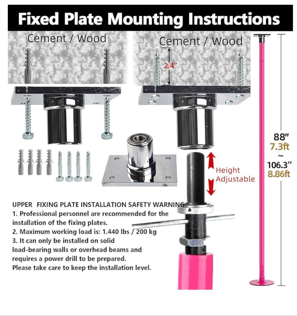 【Very Easy to Install】Prepare the installation area. Before you start installing your pole, make sure you have enough clearance around it, a stable surface to stand on, and the necessary tools and hardware. You will need a drill, screws, anchors, level, tape measure and, if you have high ceilings, a ladder or stool. It is also recommended to clean the area and remove any obstacles or hazards that may interfere with your dancing.