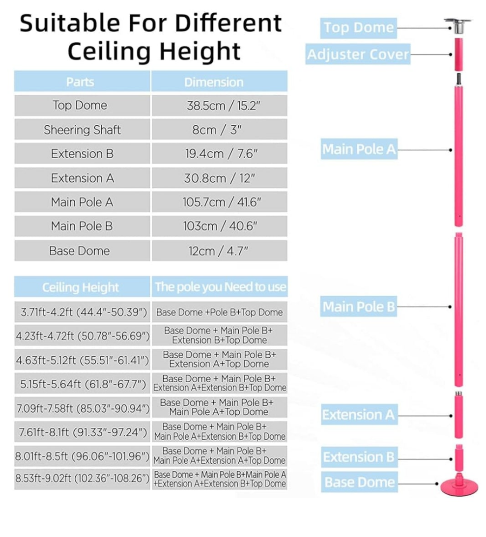 COCOMONEY.STORE ,,,,,,Fixed Plate Safer & Sturdy】Our fixed plate dance poles are safe for home studio use and fit ceilings from 7.3 to 9 feet with a diameter of 45mm. The package includes 2 extension poles and a height adjuster, but be sure to measure your ceiling height and choose the right pole size. If your ceiling is over 9 feet, we have 4 extension sizes available for individual purchase.