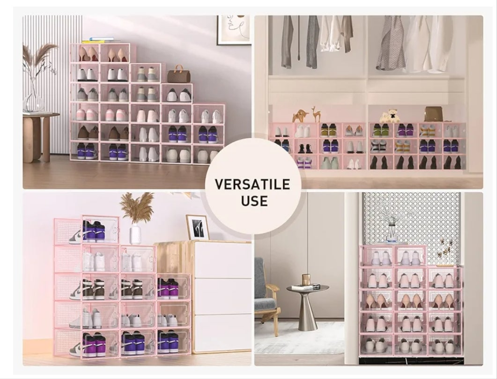 Pink X-Large Shoe Storage Boxes Organizers Clear Plastic Stackable 12 Pack, Shoe Rack & Holder Substitute, Sneaker Containers, Toy Storage Organizer Bins for Entryway, Closet, Under Bed,