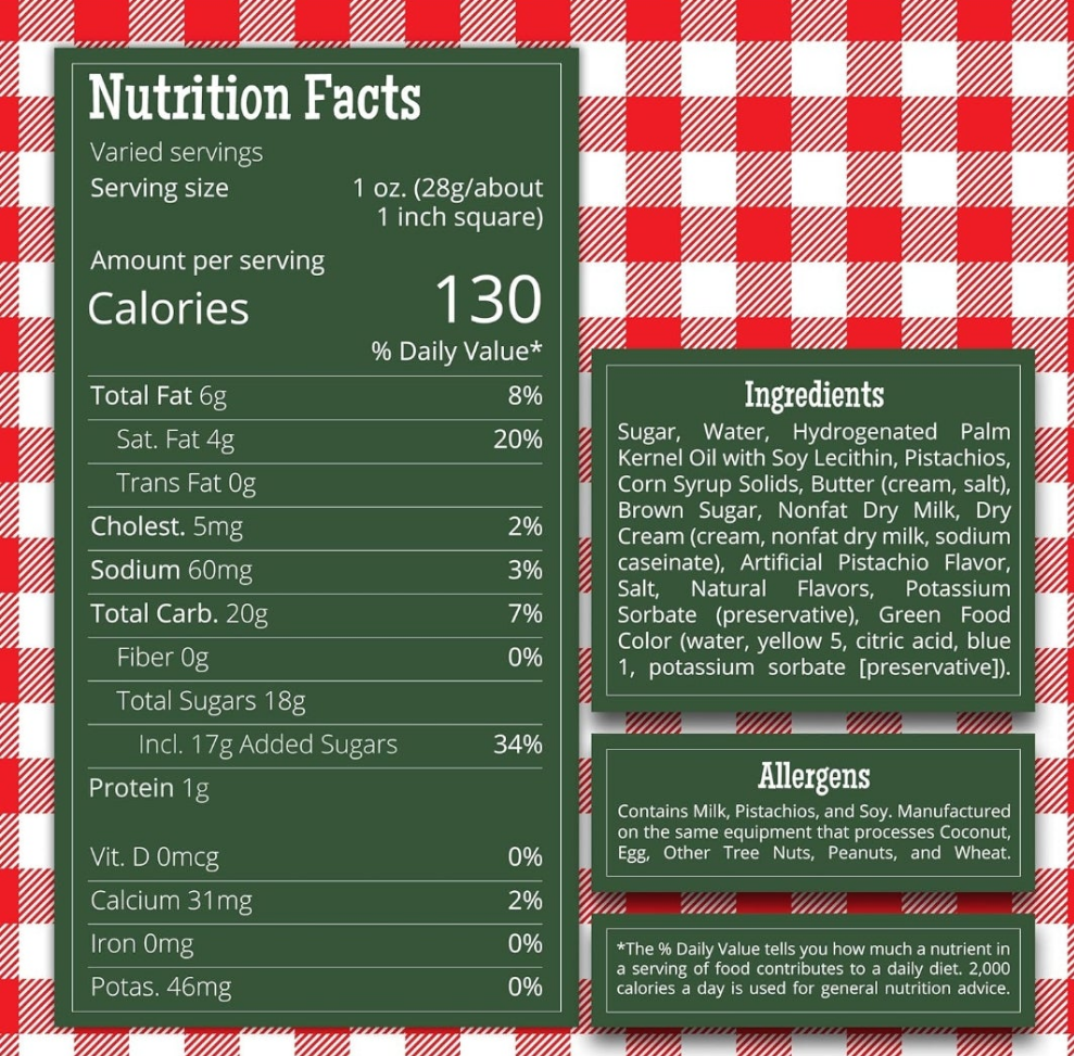 PISTACHIO NUT – This sweet and creamy Vanilla Fudge is loaded with lots of salty and crunchy pistachios. A superb flavor that’s sure to satisfy your craving for something sweet AND something salty!