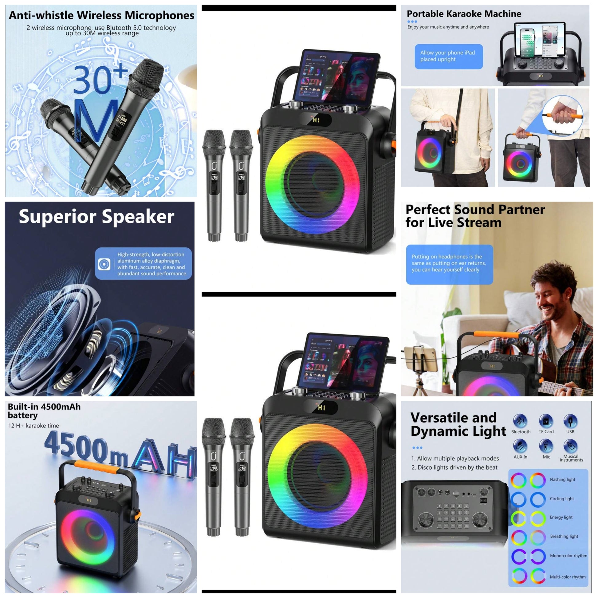 Portable Bluetooth Karaoke Machine With Dual Wireless Microphones - DJ Lights, REC, TWS Support - Ideal For Home Parties And Outdoor Events For Kids & Adults