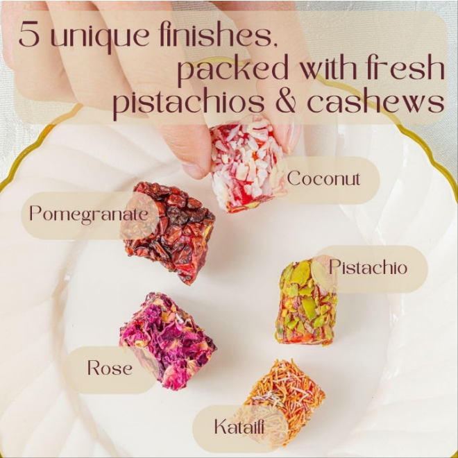 🌹 Five Unique Finishes for a Gourmet Experience: Each piece of lokum Turkish delight is coated in one of five exquisite finishes: rose petals, dried pomegranate, shredded coconut, toasted phyllo dough, and chopped pistachios. A variety of textures and flavors to satisfy every craving!