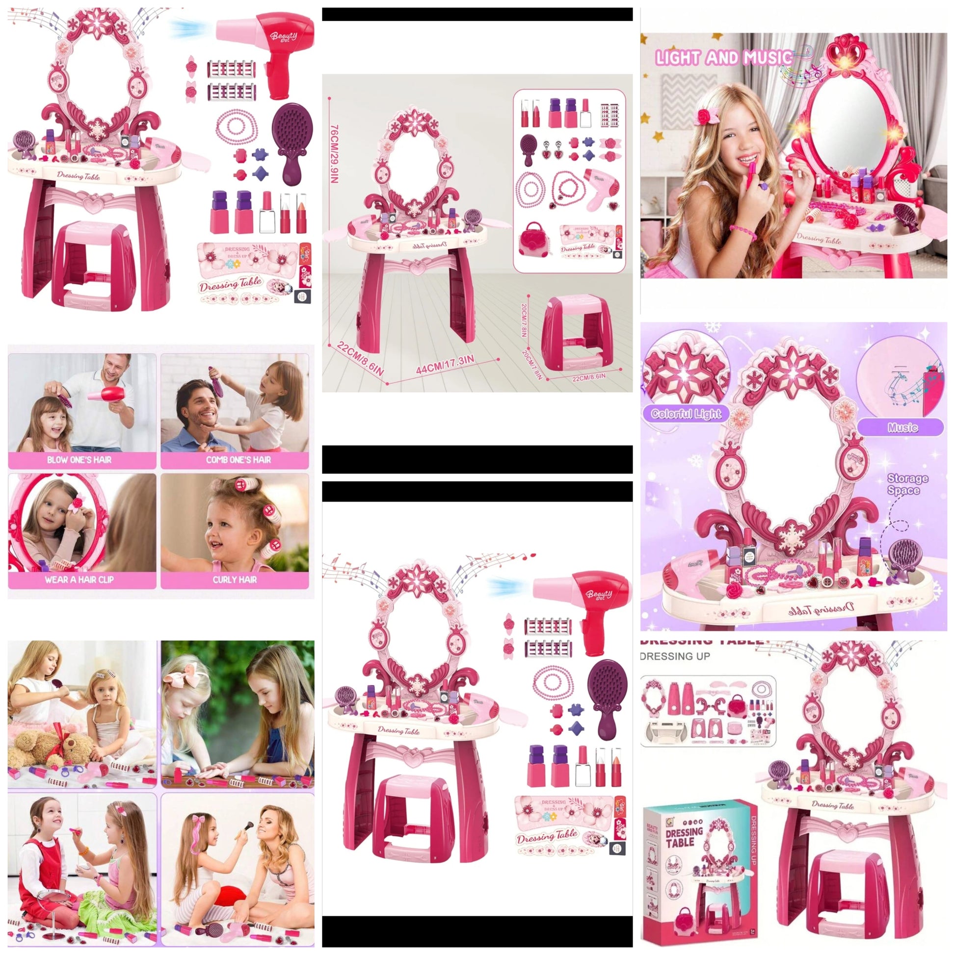 Pretend Play Girls Vanity Set With Mirror And Stool - Kids Makeup Vanity Table Set With Lights And Sounds - Includes Makeup Accessories, And Chair For Girls, Toddlers 3 and up