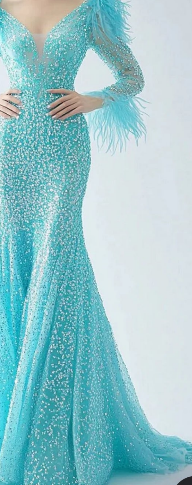 Rhinestone Feather Long Sleeve Fishtail Maxi Dress-Blue [Custom-Made] COCOMONEY