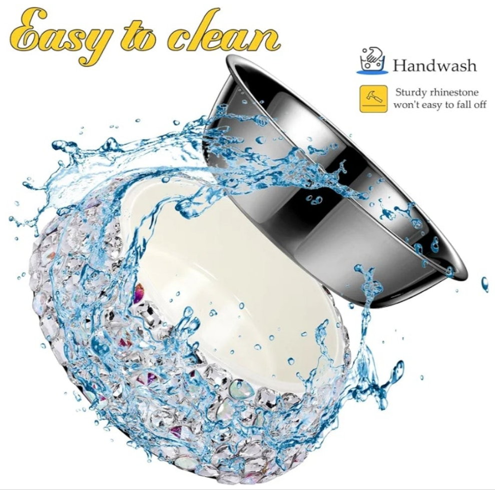 🐾Unique Design: The pink Cute dog bowls are made of premium sparkling rhinestones material, dog cat and pets universal bowls are beautiful and fashionable in appearance and easy to clean