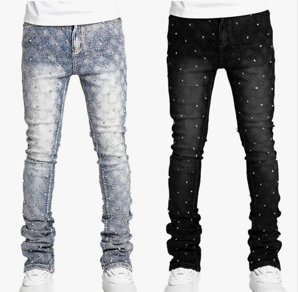 Rhinestone Skinny Stacked Jeans Mens Straight Leg Jeans Casual Pants Slim Fit Jeans Vintage Grunge Hip Hop Pants