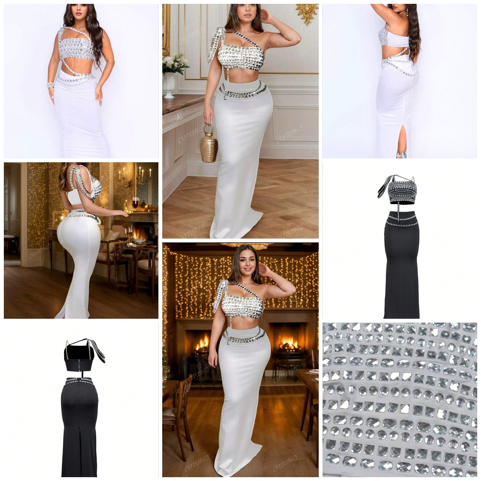 Rhinestone Ultra-Short Top With Slim Hip Slit Half-Body Skirt Ladies Party Dinner Two-Piece Set COCOMONEY