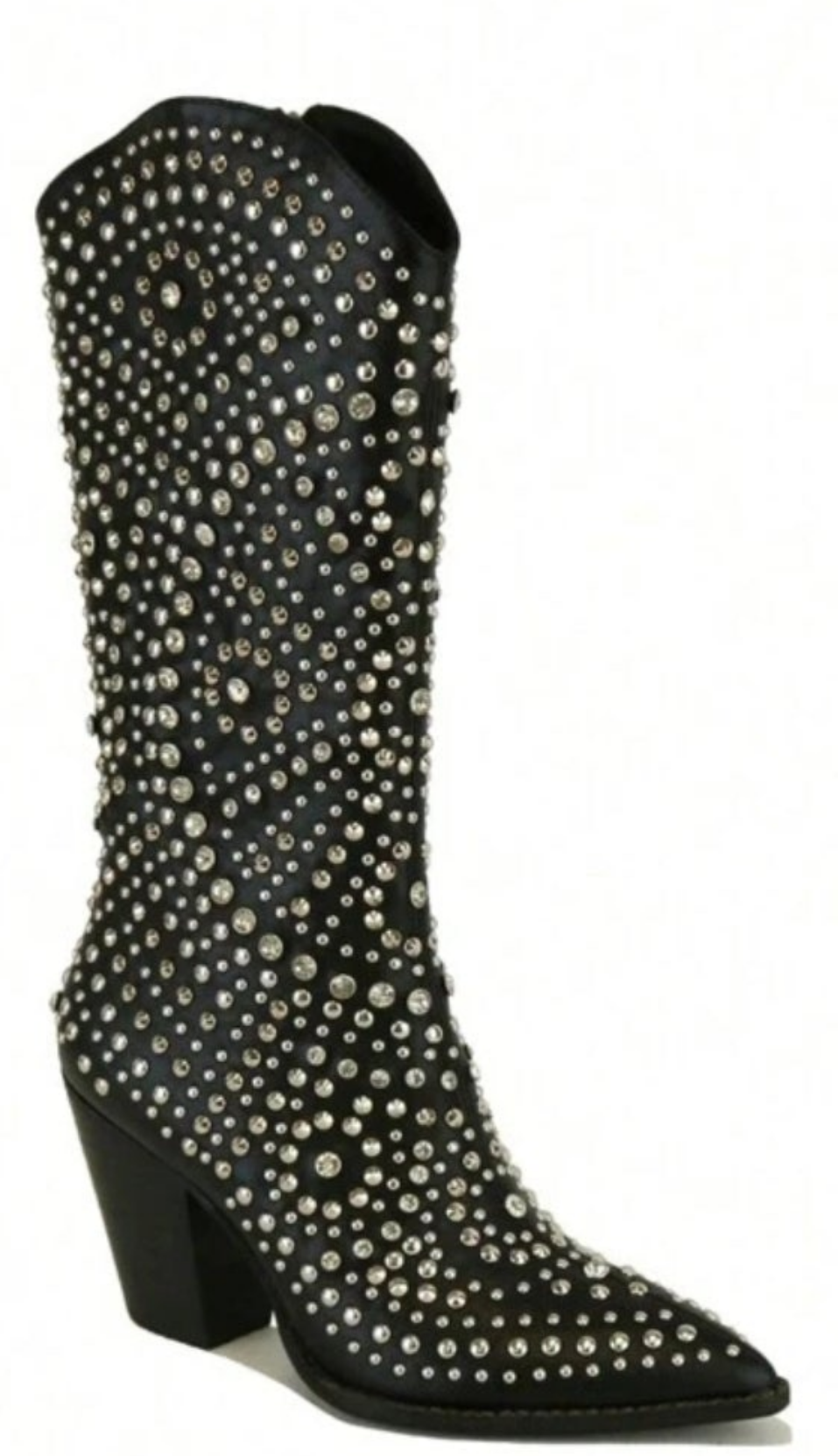 Rhinestone Western Knee-High Boots Point Toe Chunky Stacked Heel Party Boots