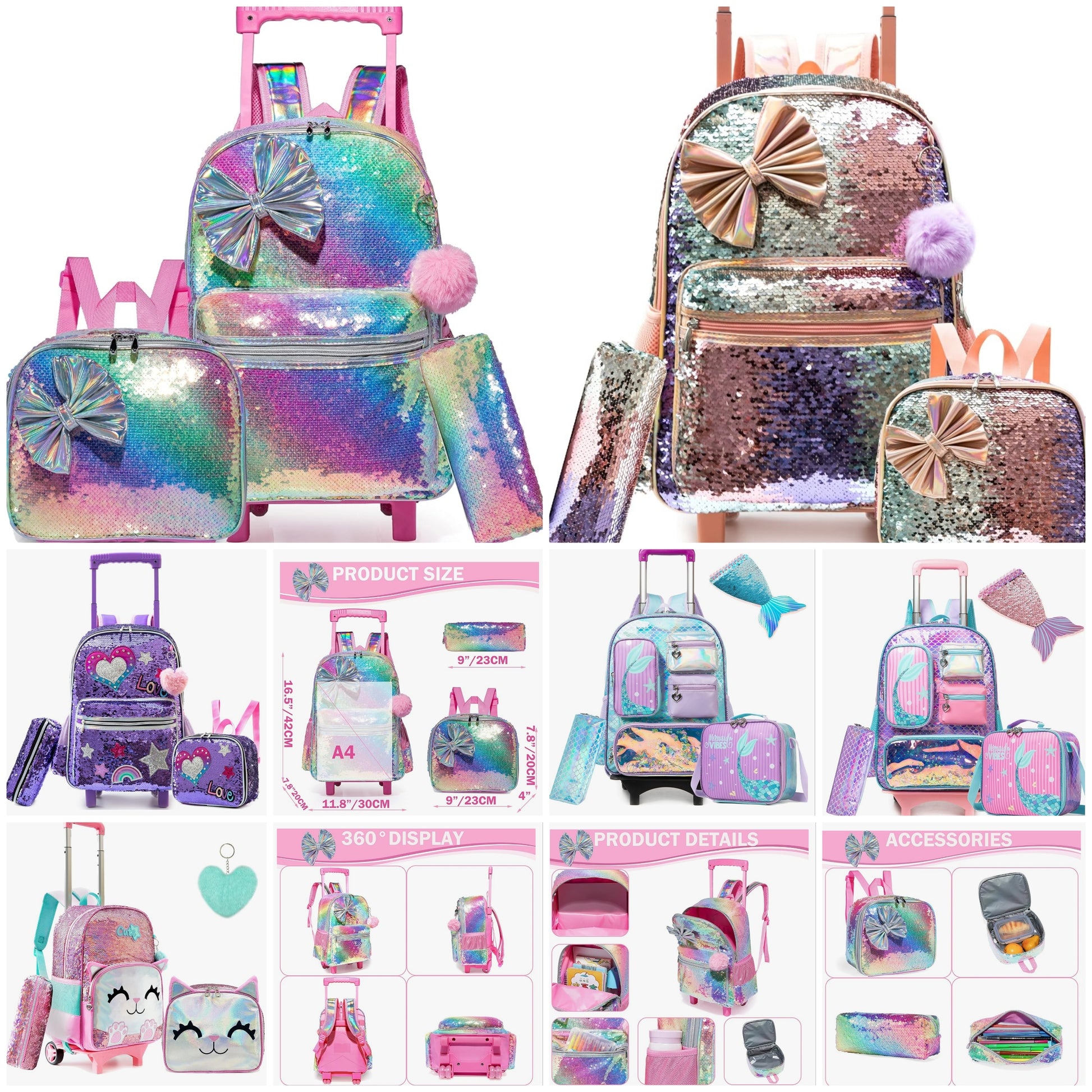 COCOMONEY.STORE. Girls Rolling Backapck Size]4 in 1 girls rolling backpack,you will get 1 backpack,1 lunch box,1 pencil case and 1 pendant.★Backpack:16.5"X11.8"X7.8"Lunch Box:9"X7.8"X4"Pencil Case:9"