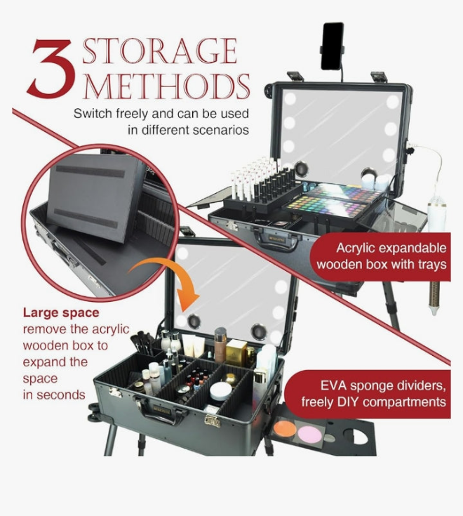 【SPEAKER】- equipped with 2 built-in speakers, you can link to your mobile phone music app to work fashion, sound quality, strong appeal, give you a different kind of enjoyment. 【PREMIUM QUALITY & LOOK】- sturdy aluminum frame, reinforced corner, MDF exterior and PU interior make this makeup case last for years; widely used in fashion runway as temporary makeup station and beauty travel luggage. Great for salon use, shopping mall display, home and freelance makeup artists and dance competition need.