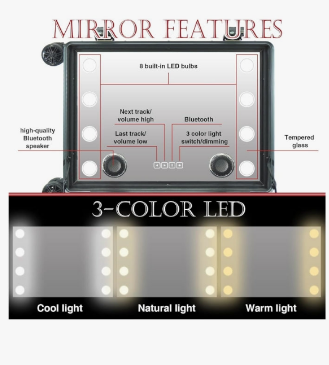 【TEMPERED MIRROR】we use tempered glass for mirror, HD reflection, not easy to break, last for years. 【CELL PHONE MOUNT】We add a mobile mount above the case, you can wathing movies or doing live streaming when you makeup.