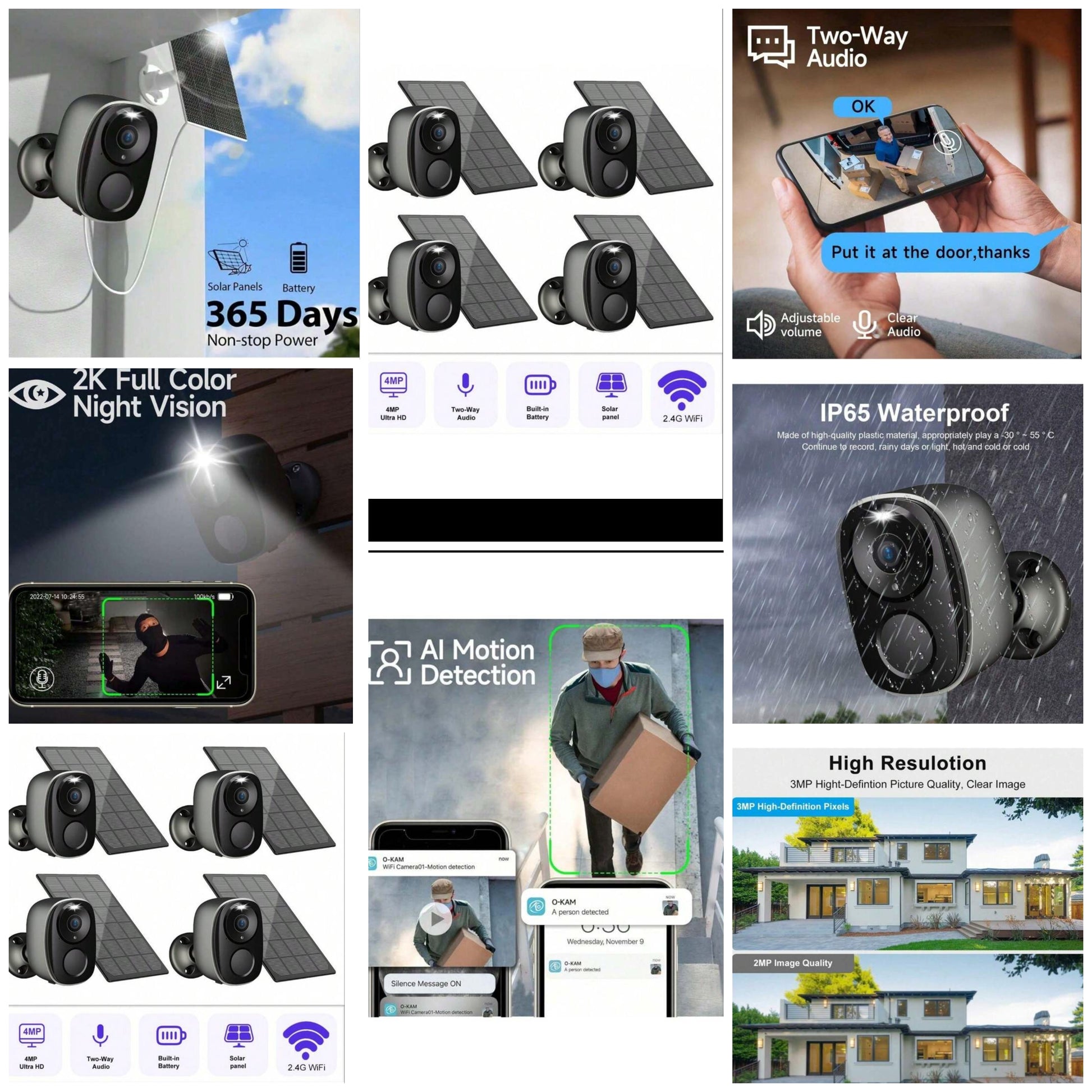 Solar Security Cameras Wireless Outdoor 4 Pack - Battery Powered 4MP Video Surveillance Cameras For Home Security & Monitor, Full Color Night Vision, PIR Motion Detection, Two Way Audio