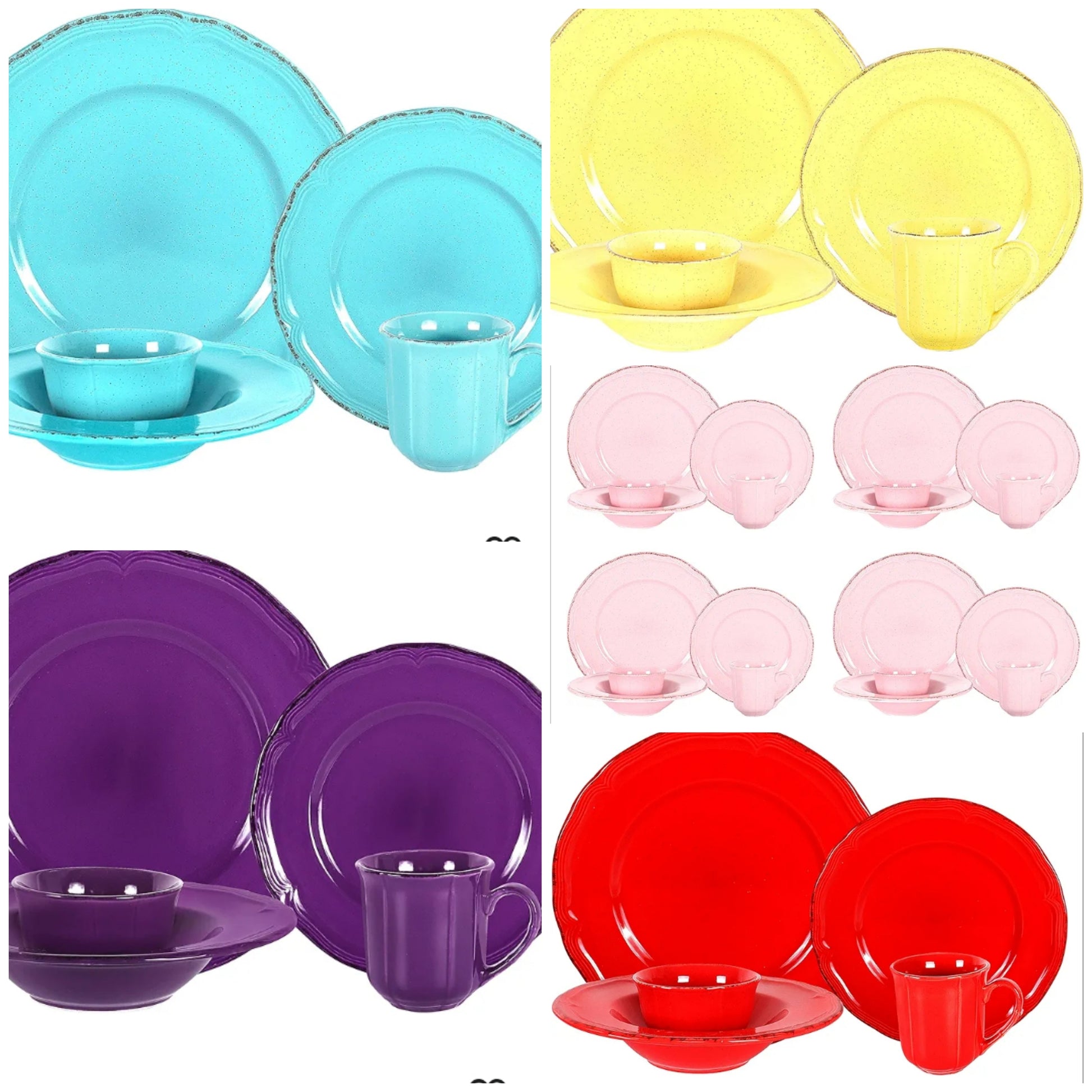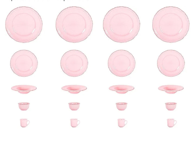 20pc Set: Service for 4, Including 4 of each of the following: Dinner Plate 10.5", Salad Plate 8", Soup/Pasta Bowl 8.9", Fruit/Dip/Sauce/Ice Cream Bowl 4", Mug 13oz, Embossed French Countryside with Antique Pink Color