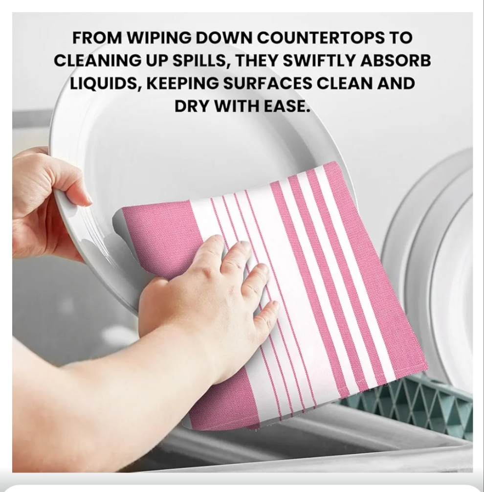 VERSATILE: Kitchen Towels functionality extends far beyond just drying dishes. These handy towels can be used for a myriad of tasks in the kitchen and beyond.From wiping down countertops to cleaning up spills, they swiftly absorb liquids, keeping surfaces clean and dry.They act as reliable pot holders, protecting hands from hot handles and surfaces.Their soft and gentle texture makes them ideal for drying hands or faces, and they can even be repurposed as makeshift placemats during casual meals. Trendy Stripes weave with Unique colours stripes adds attractive looks to your kitchen.