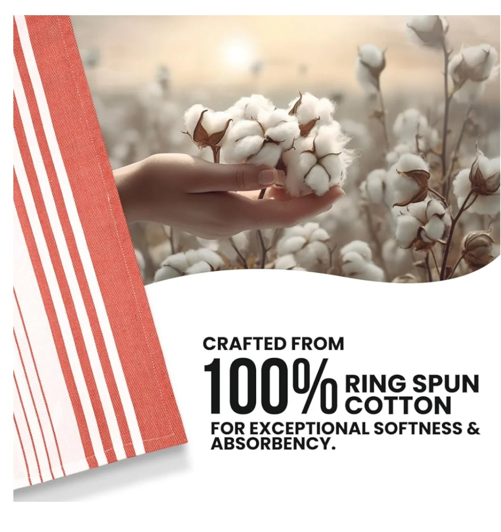 SUPER ABSORBENT & QUICK DRYING: Crafted from 100% Ring spun cotton, these kitchen towels are a valuable choice for any kitchen due to their excellent absorbency, softness, and durability. They effectively dry dishes, wipe surfaces, and clean up spills while remaining gentle on delicate items, proving to be an essential addition to your culinary routine. From drying hands to tackling everyday messes, these cotton towels demonstrate their worth by delivering consistent performance and reliability.