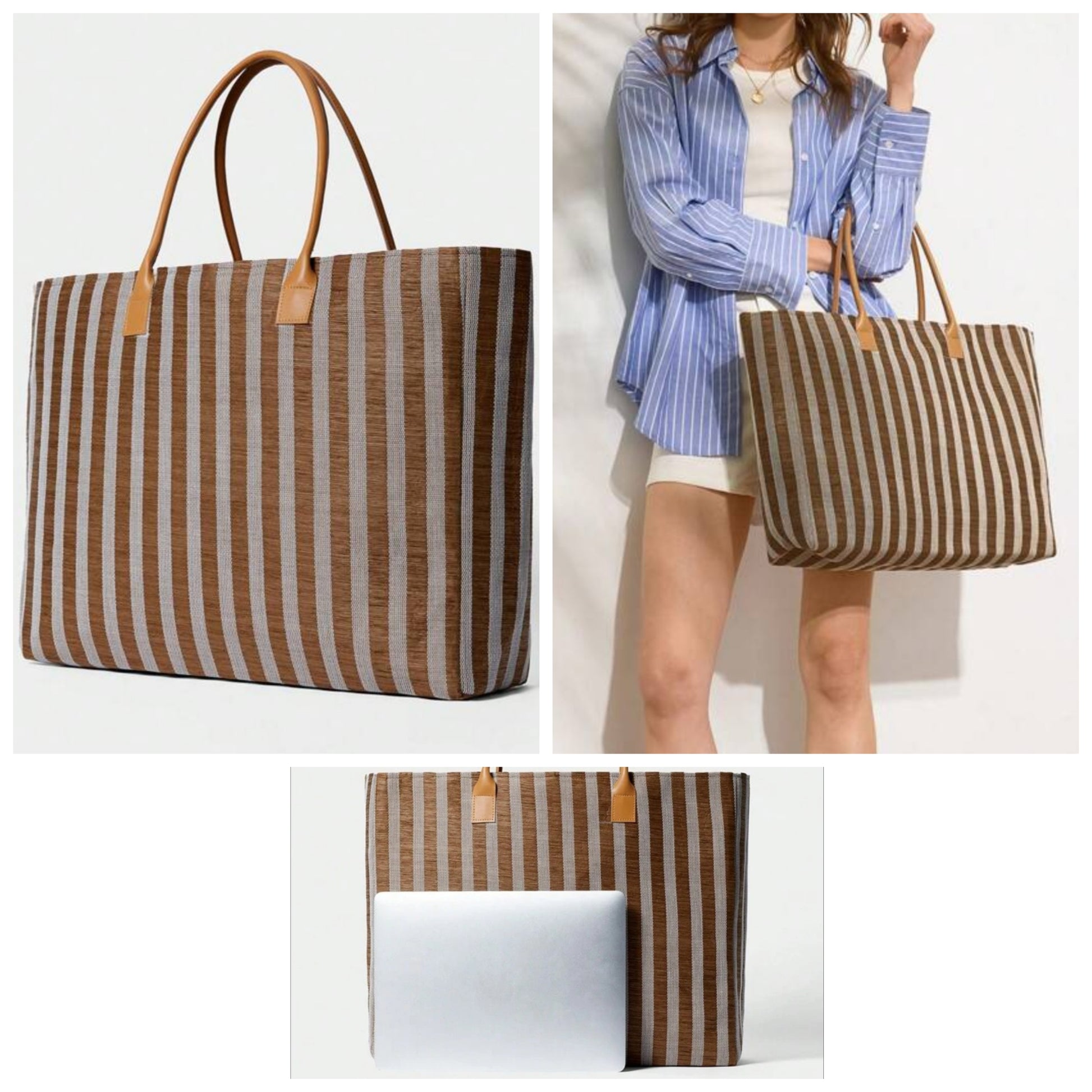 Striped Simple Handbag, Daily Casual Storage Bag Travel Bag Beach Bag COCOMONEY