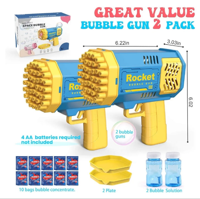 BUBBLE MACHINE 2-PIECE SET: This bubble machine includes 2 pieces of bubble wands with extra 2 refills, and 10 bags of bubble concentrate. And 2 colors of bubble blower are provided to match any color (blue and pink)