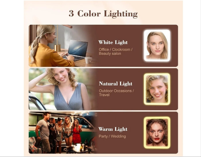 【3 Color Lighting Make Up Mirror】The lighted makeup mirror offers 3 optional colored lights: outdoor natural light, office cold light and evening warm light, which mimic the lighting of various occasions to see how your makeup looks in various lighting situations such as day, night and work environment. A vanity mirror with lights will let you say goodbye to wrong lighting and imperfect makeup, avoiding makeup disasters and embarrassing situations.