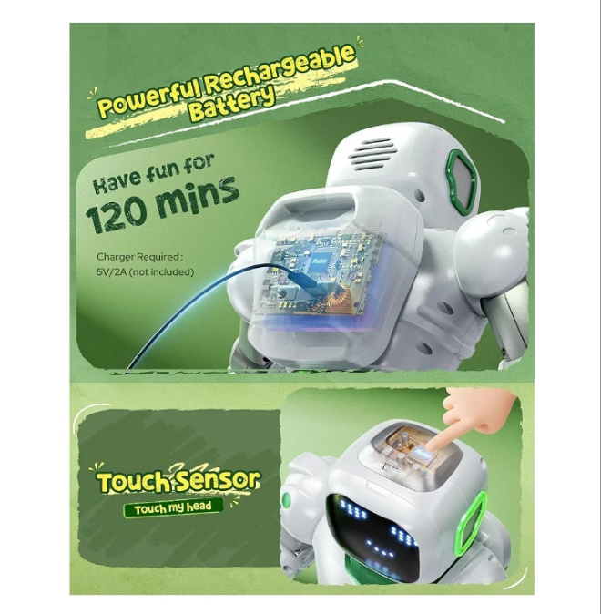 【RECHARGEABLE BATTERY】 The Ruko robot charges in 150 minutes for up to 100 minutes of play. A red light shows it’s charging, and turns off when complete. A low-power reminder also helps manage screen time responsibly.
