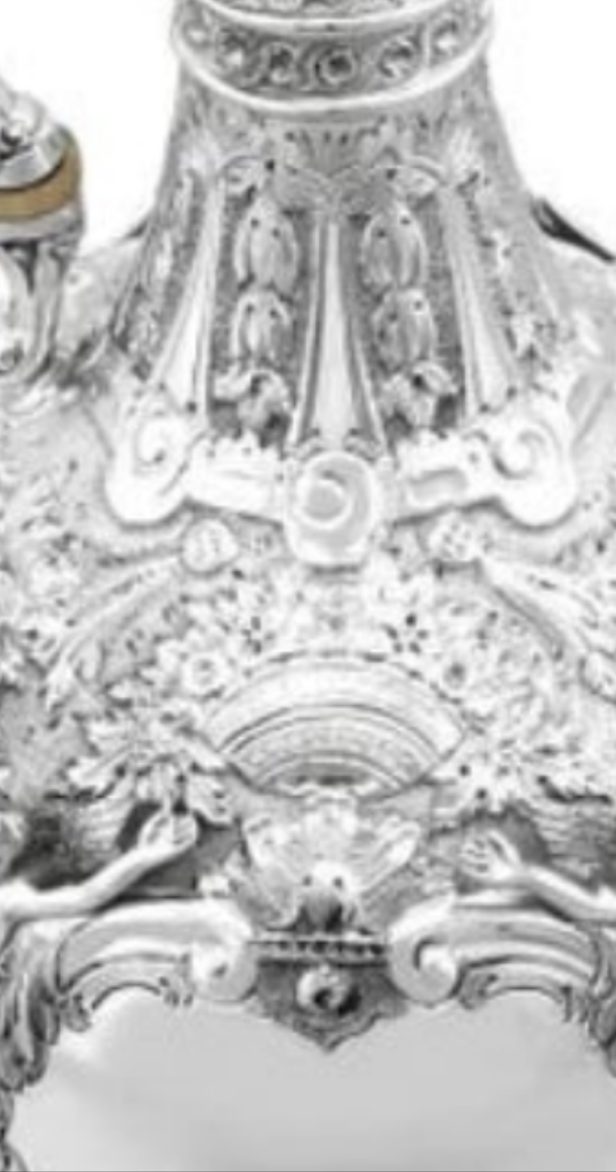The cylindrical neck of the silver claret jug is embellished with exceptional cast and chased floral and scrolling foliate decoration, all on a matte background.