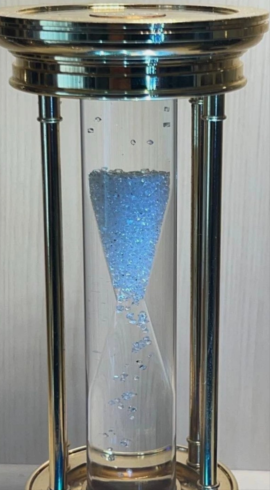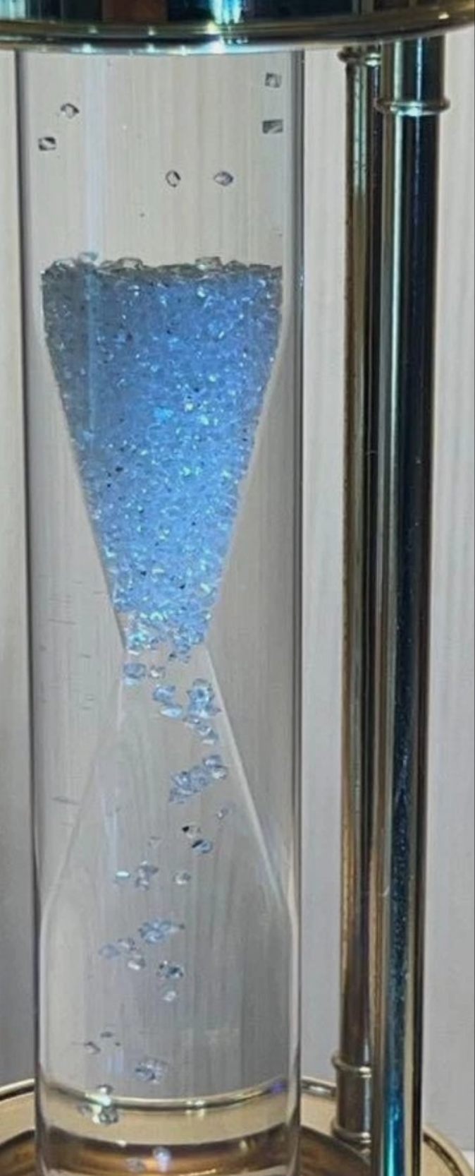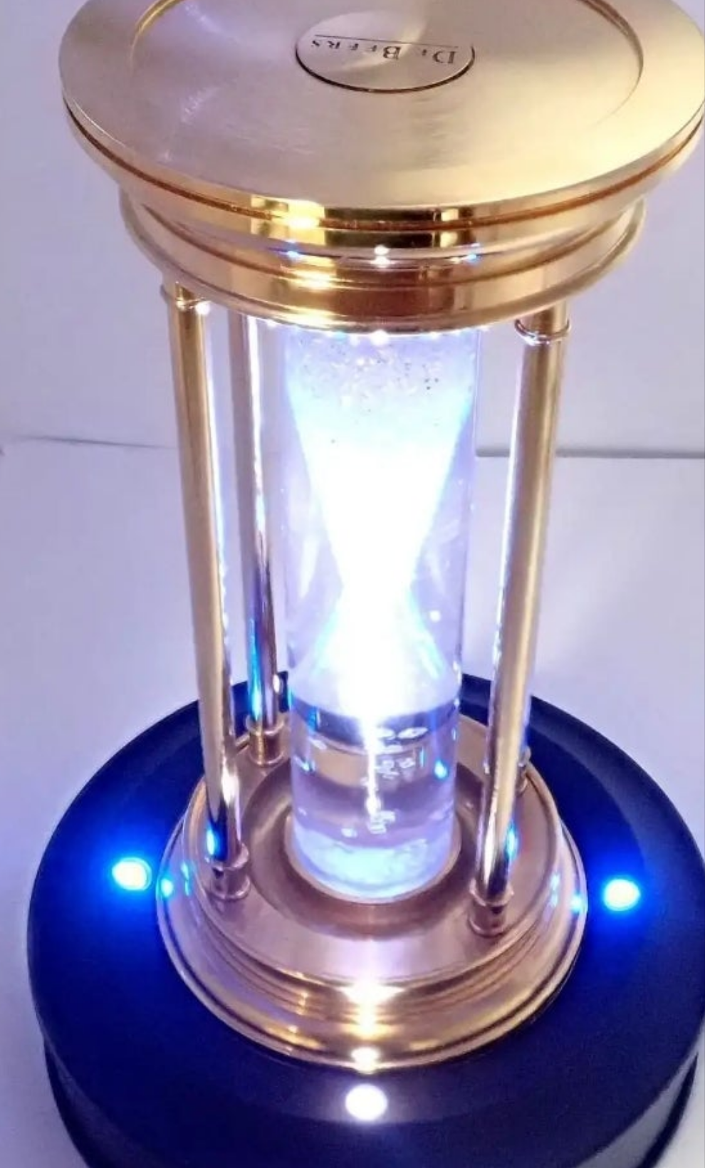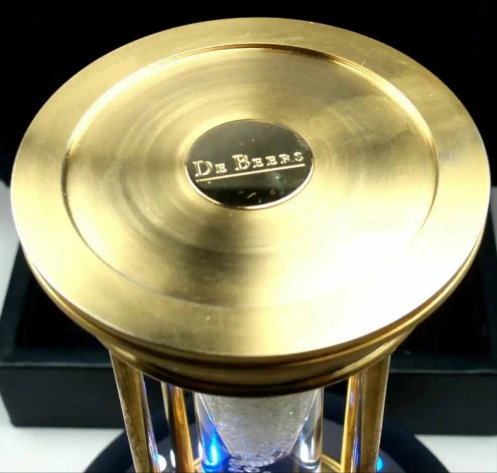 COCOMONEY.STORE,,,,AUTHENTIC VERIFIED INSPECED GUARANTEED,,,,This item comes with pedestal and box. Containing a cascade of over 2000 natural rough diamonds, weighing approximately 36 carats, suspended in a silicone fluid contained in a brass and acrylic reversible timer, duration approximately ten minutes, with battery operated illuminated stand, case signed 148 mm. high