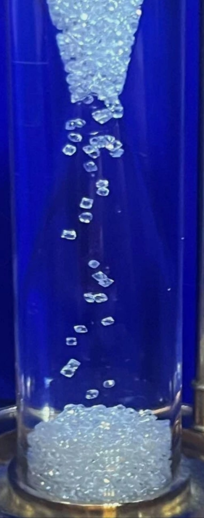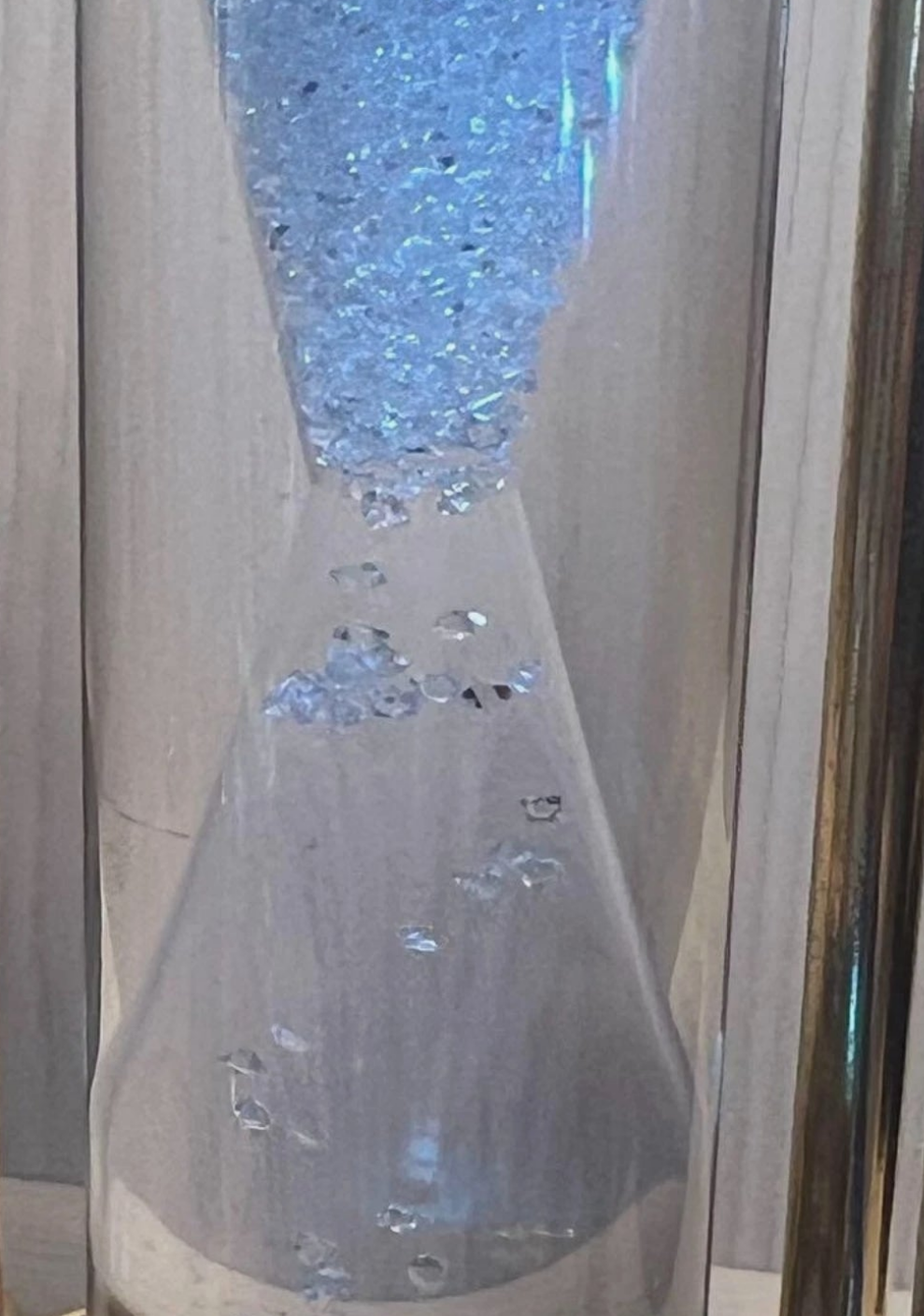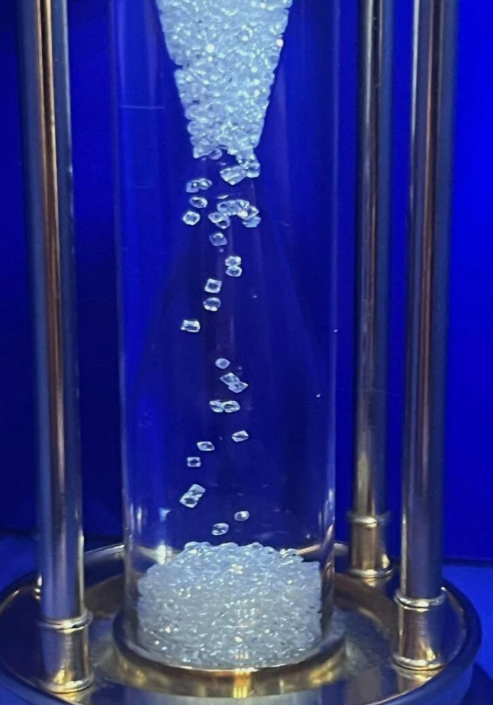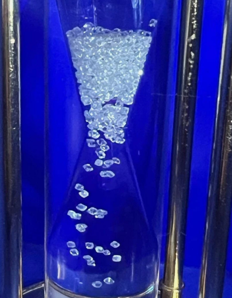 COCOMONEY.STORE,,,,AUTHENTIC VERIFIED INSPECED GUARANTEED,,,,This item comes with pedestal and box. Containing a cascade of over 2000 natural rough diamonds, weighing approximately 36 carats, suspended in a silicone fluid contained in a brass and acrylic reversible timer, duration approximately ten minutes, with battery operated illuminated stand, case signed 148 mm. high