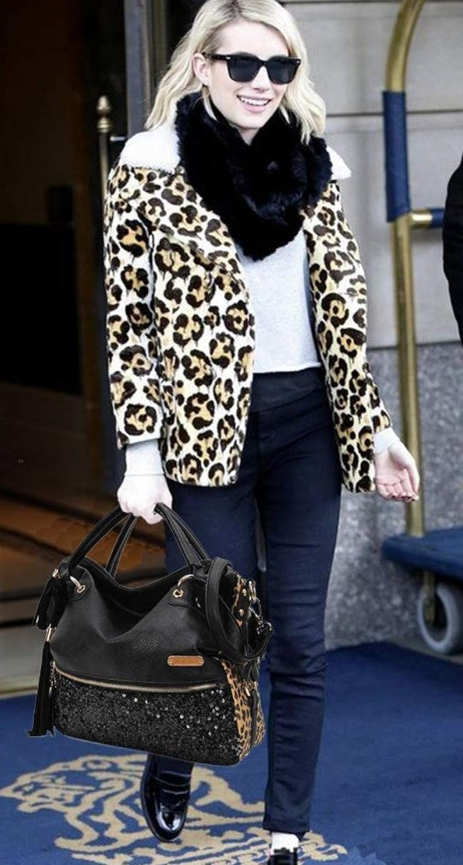 Feature: FASHION BAG,sequins and leopard print,make it more fashion and dazzling.There are two tassels zippers compartment in the front and back,it's easy to put small items in it.