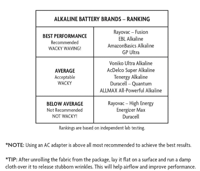 SPECIFICATIONS: 17-inch waving tube man with fan in base to make him dance, wiggle, and shake just like the real thing (batteries not included)