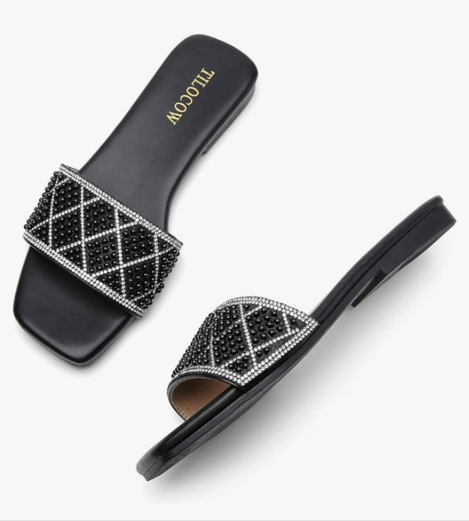 【Versatile Style】 The exquisite embellishments of rhinestones and pearls make these flat slippers versatile for various occasions. Whether you're attending a wedding, a party, or simply want to add a touch of glamour to your everyday outfits, these slippers are a perfect choice.
