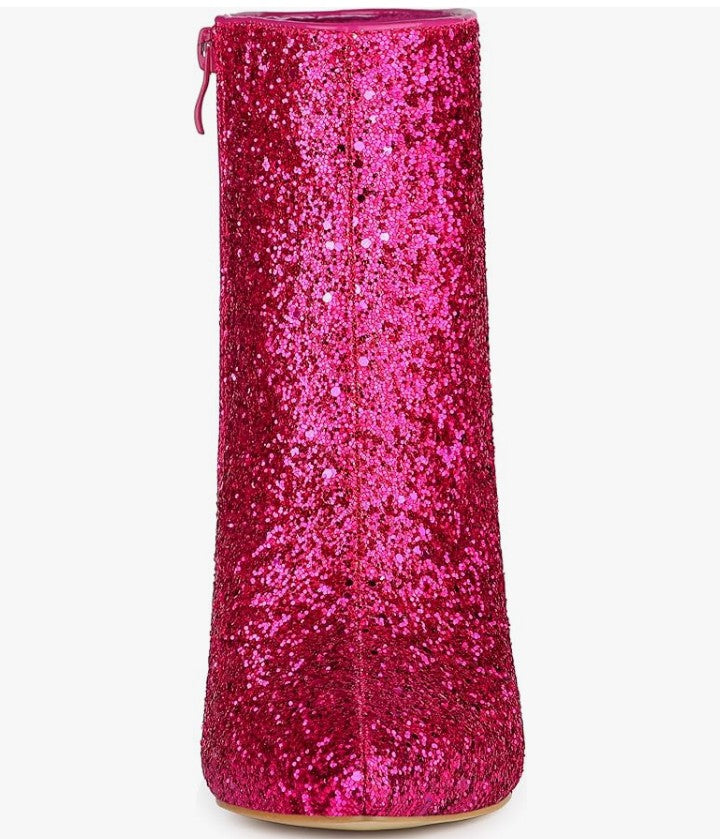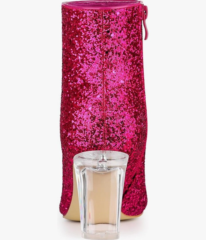 Glitter Ankle Booties, Clear Heel, Block Heel, Zip Closure